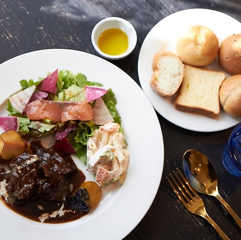 ランチタイム限定の人気メニュー「ビーフシチュープレート」は、じっくりと煮込まれたお肉が口の中でとろける贅沢な一品です♪サラダと焼きたてパンがセットになっており、パンはおかわり自由なのも嬉しいポイント!食後にはソフトクリームも付いてくるので、満足感たっぷりです。