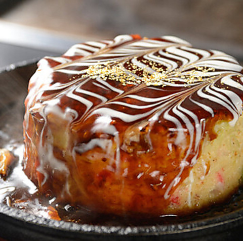 金粉をちらしたちょっと贅沢なオコです 赤ワインで煮込んだ豚肉、もち、チーズ、ツナ、コーンが入ってます※オコは焼き上がりに30分程かかります