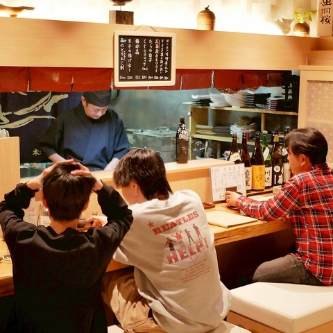 【1名様~】お一人様からでも広々とお使いいただける掘りごたつ式のカウンター席となっております。目の前で職人がふるまう様子をお楽しみください。