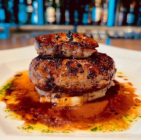 シェフ自慢の手ごねハンバーグは、ジューシーでふわっと柔らかな食感です♪フォアグラのソテーとトリュフのソースを贅沢にまとわせた、至福の一皿をお楽しみください。和辛子を少し効かせたマッシュポテトとの相性も抜群!一口食べれば、口の中に豊かな香りと旨みが広がります。