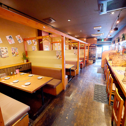 1Fの広~いテーブル×ベンチタイプのお席は、お子様連れでもゆったり座れます。通路をはさんだ向かい側はカウンター席。カップルでご利用ください。