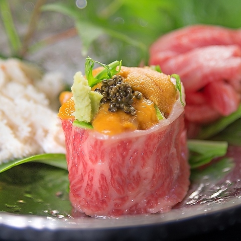 野菜を牛ロースで巻き上げ、雲丹をトッピングした贅沢な創作巻きです。
