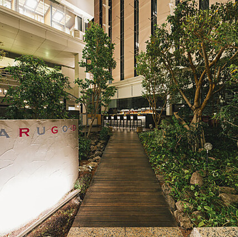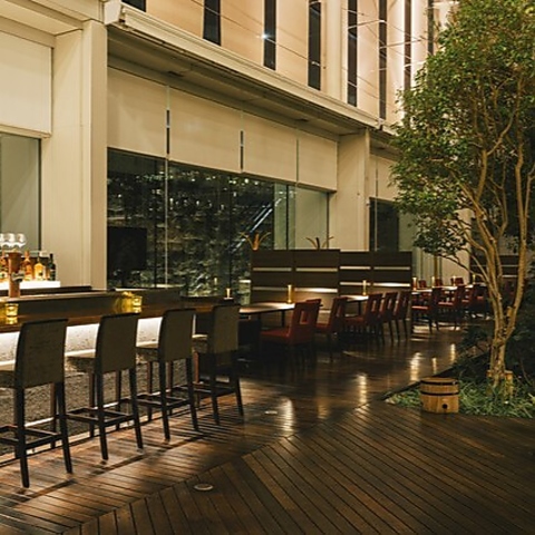ゆるやかなスロープを下り、暖色のライトにぼんやりと照らされた幻想的な空間へ足を踏み入れれば、そこは非日常の世界。地下1階から4階まで続く吹き抜けの開放的な空間は、天井が高く広々としています。シックなパーゴラエリアや、開放的なウッドデッキエリアで、ゆったりと流れる時間をお過ごしください。