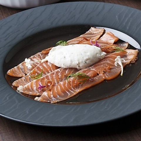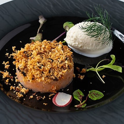 香ばしい燻製の煙とともにお席までお持ちする、自家製のスモークサーモン。口に入れた瞬間に広がる燻製の香りが、サーモンの旨みを一層引き立てます。フロマージュブランと爽やかなハーブのムースを添えて、風味豊かな一皿に仕上げました。目と舌で楽しむ、贅沢な逸品です。