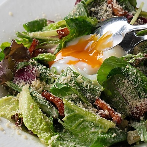 山形産のこだわり卵「紅花たまご」の温泉卵を乗せたシーザーサラダ。崩した卵を絡めて食べるのがおススメ!!