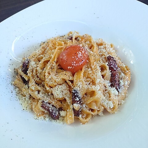 山形県産「紅花卵」を使用した濃厚なコクとカリカリベーコンの本格カルボナーラ。コクのある白ワインと相性抜群!!
