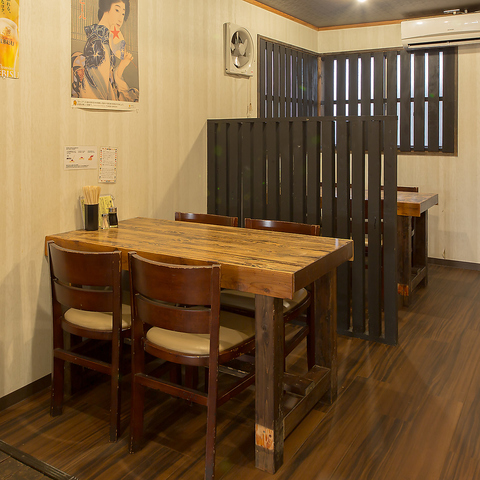 気軽な食事や一杯に最適なカウンター席を14席ご用意しております。お一人様でもゆったりと過ごせる設計で、落ち着いた時間をお楽しみいただけます。また、4名様用のテーブル席を2卓設けており、ご家族での食事やご友人との会食、グループでのご利用にも対応可能です。人数や目的に合わせて、快適にお過ごしいただける空間をご提供しています。