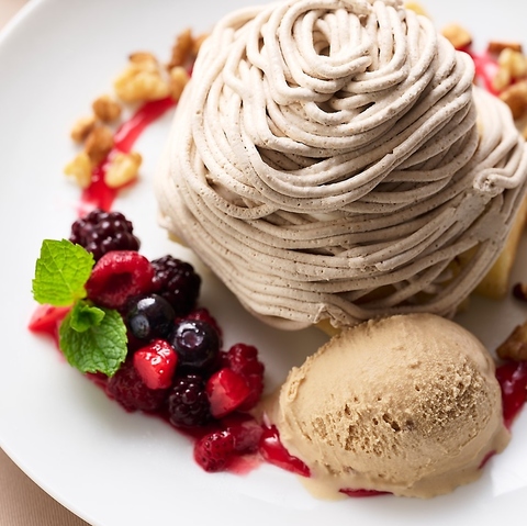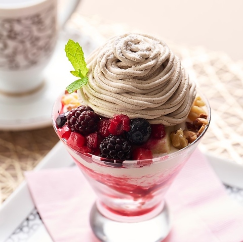 イタリア栗薫るマロングラッセのジェラートにマロンホイップをたっぷりと絞り、4種のベリーと食感のアクセントにミックスナッツを盛りつけた贅沢なパフェです♪