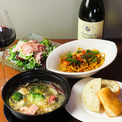 肉と海鮮の贅沢なハーモニーを楽しめるコースです。【絶妙な旨み】が口の中で広がり、思わず笑顔がこぼれます。バケットはお代わり自由で、たっぷりと楽しめる2.5時間の飲み放題も魅力的。友達と一緒に盛り上がるにはぴったりのディナータイムをお過ごしください。