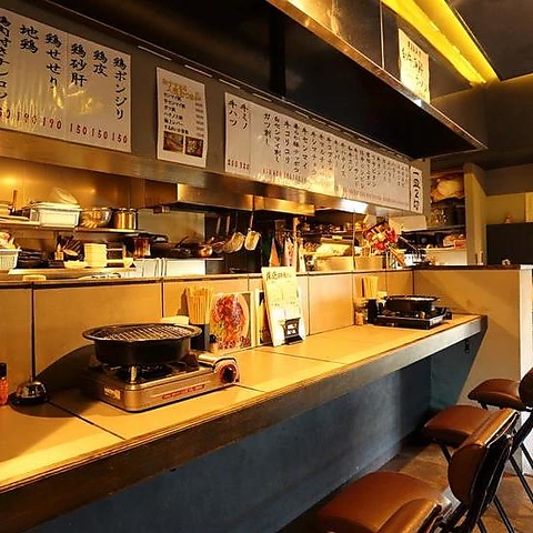 カウンター席は気兼ねなく楽しめる特等席。仕事終わりにハイボールとホルモンをさっと堪能するのに最適です
