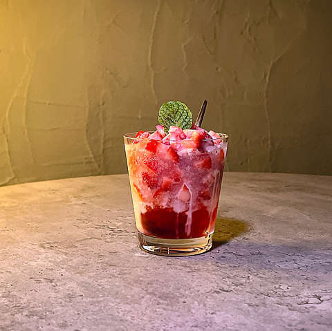いちごの甘酸っぱさとクラッシュアイスの冷たさが重なる、“大人のデザートカクテル”。練乳がほんのりとコクを添え、ほどよい甘さの余韻が静かに広がります。見た目は愛らしく、味わいは上品に。ノンアルでも楽しめるので、ひと息つきたい夜にもぴったりです。