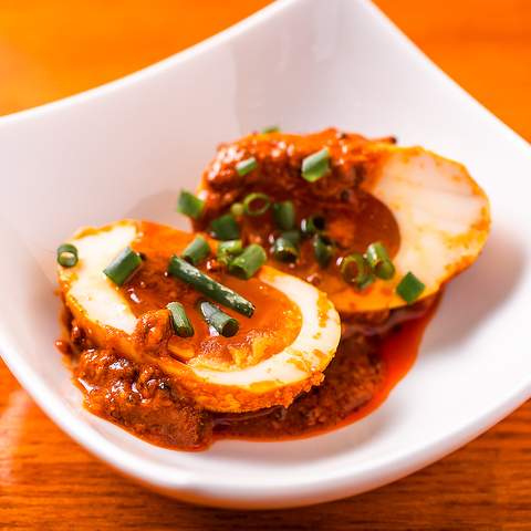 和のダシとスパイスで一晩漬け込んだ半熟煮卵は、程よく味がしみ込み、豊かな風味が楽しめます。お酒のおつまみにぴったりで、カレーのお供としても絶妙です。色々な楽しみ方が出来る一品となっておりますので、ぜひ一度お試しください。