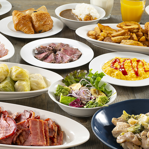 種類豊富なサラダにビーフステーキなど、50種以上の和洋メニューが並ぶビュッフェで贅沢な朝のひとときを♪