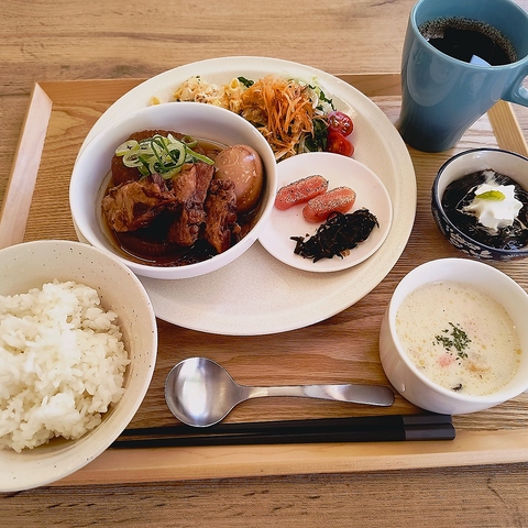 ドリンク、サラダ、スープ、一口デザートまで!!当店で一番お得なセットを平日ランチ限定でご準備しています。メニュー内容は週または日替わり、ごはんセットまたはパスタセットのみの準備です。(写真は大根と豚軟骨のほろほろ煮)