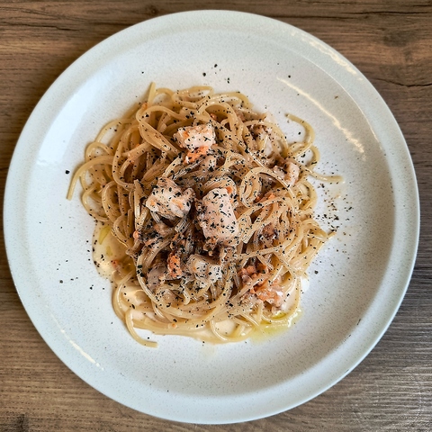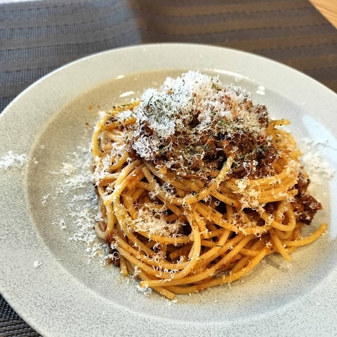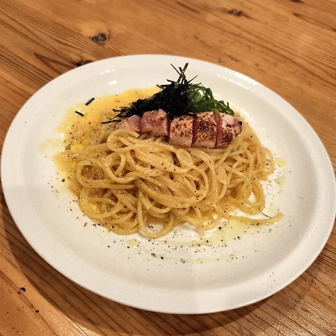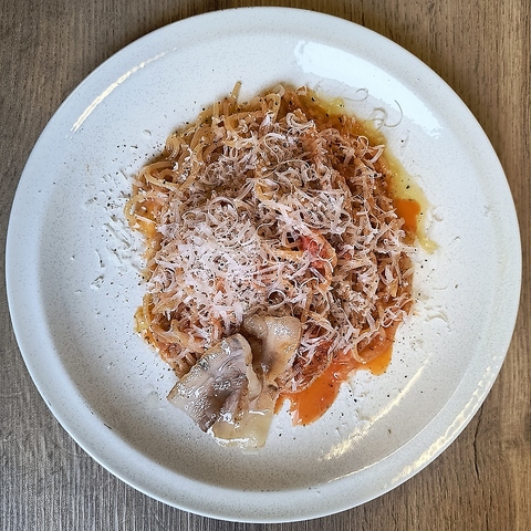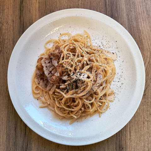 パスタを炭焼きに!!ソースのベースには野上養鶏場の味宝卵、イタリア産の3種のチーズをブレンド。そこに自家製パンチェッタの熟成されたお肉の旨みをプラス。チーズの濃厚な旨み、まろやかな玉子、黒胡椒、炭の香りがやみつきなる一品です。当店でしか味わえない一品を是非一度お試しください。