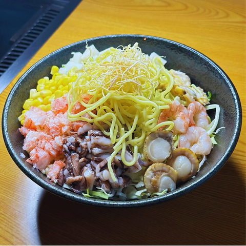 イカゲソ・ホタテ・エビ・アサリ・モチ・コーン・カニが入った当店1番人気のもんじゃ焼!完全オリジナル出汁の旨ダレもんじゃ焼です