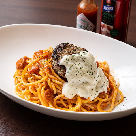 ランチでは特製ナポリタンをご提供!ホワイトソースをかけたハンバーグが乗り、万福感ある一品です☆