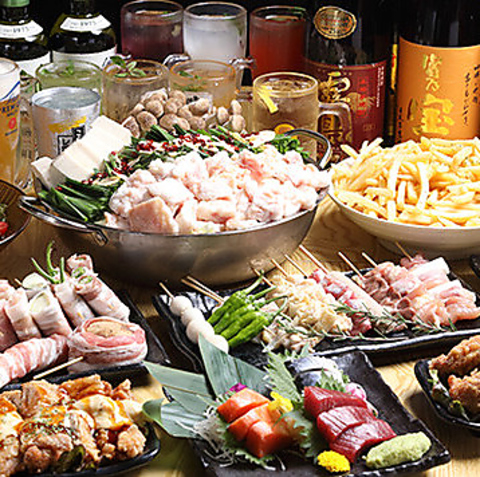 本日の前菜から鮮魚盛り、チキン南蛮、焼き鳥、選べる鍋まで全9品!〆とデザート付きで満足度◎。30種以上の飲み放題付きで3,828円(税込)!会社宴会に最適!