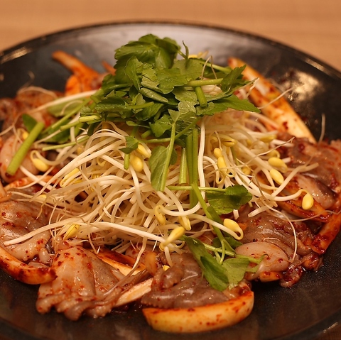 甘辛に味付けされたチュクミは豆もやしや野菜と一緒にサンチュに包んで。マヨネーズやたくあんの相性は◎。
