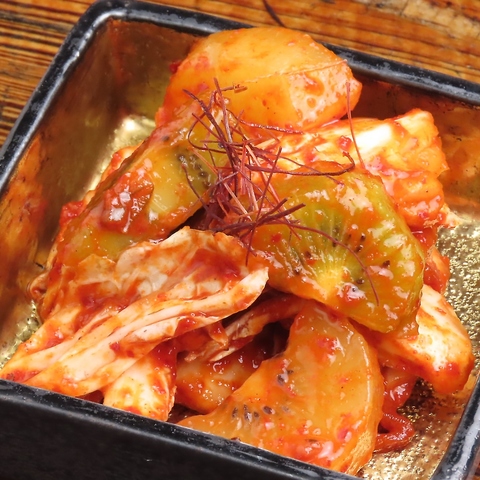 焼肉のお供にぴったり!旬のフルーツをふんだんに使った、さっぱり爽やかなサラダ感覚のフレッシュキムチ。ピリ辛の味わいに、果物の自然な甘みと酸味が絶妙にマッチ。脂ののったお肉との相性も抜群で、箸休めにも〆にもおすすめの一品です。季節限定の味わいをぜひご堪能ください。