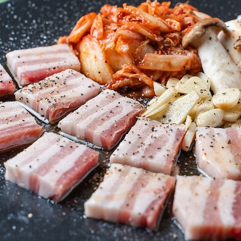 旨辛い!人気の韓国料理「サムギョプサル」を当店でもご用意◎デートや飲み会シーンでもオススメ!〆の韓国チャーハン(ポックンパ)とデザートまでご賞味いただけます♪