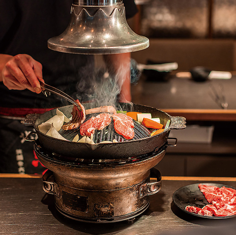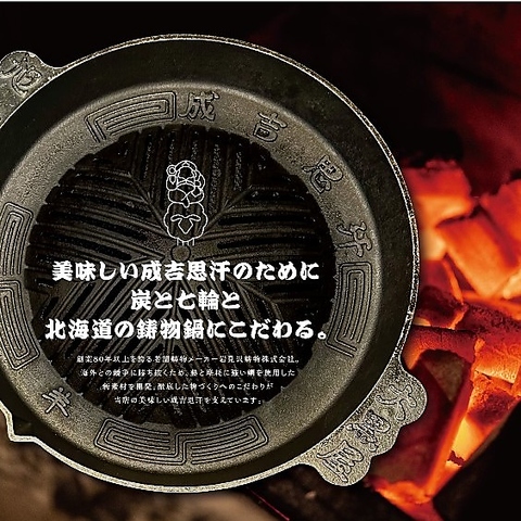 当店で使用する炭は、創業90年の老舗店からの炭を取り寄せ使用。創業当初から変わらぬ七輪+ジンギスカン鍋のスタイルで炭の香りと共に、ジンギスカンをご堪能いただけます。炭で熱したジンギスカン鍋で焼くと、旨味と脂が溢れだしお肉はもちろんお野菜との相性も抜群です。