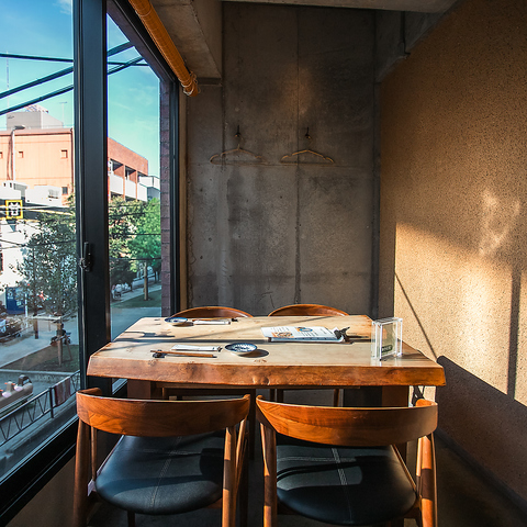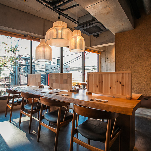 木の温もりを感じる落ち着いた和モダンな空間です。コンクリートうちっぱなしと木の温もりある和モダンな店内は洗練された雰囲気。都会の喧騒から離れて、ゆったりとした時間をお過ごしいただけます。お一人様からご家族、ご友人との会食まで、さまざまなシーンにご利用いただけます。