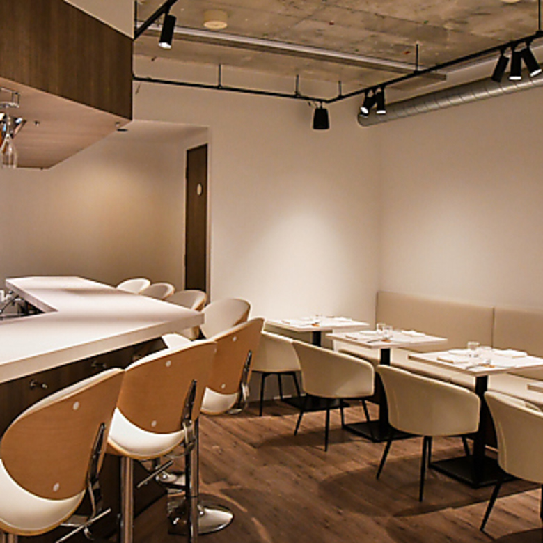 料理の美しさを引き立てる、落ち着いた内装が特徴です。シンプルながらも上質な家具が配された店内は、大切な人との会話を邪魔しない落ち着いた雰囲気。テーブル席はゆったりとした間隔が確保されており、プライベートな時間を大切にできます。
