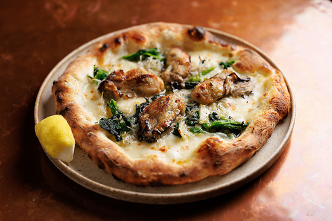 宮城県産牡蠣を贅沢に使用した人気の一枚海の旨みとチーズのコクが溶け合う、notte自慢の薪窯ピッツァ。