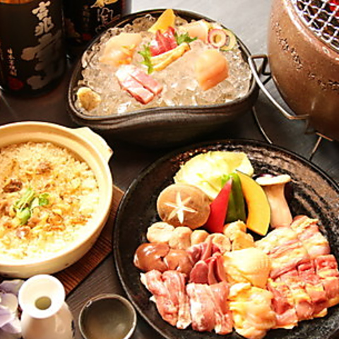 新鮮なさつま地鶏をふんだんに使用したお料理をお楽しみいただけます!お造り5種、炭火焼9種、地鶏釜飯など、全18品の豪華なラインナップで、地鶏の旨味を存分に堪能できます。炭の香りが漂う中、七輪で焼き上げた炭火焼は絶品で、地鶏の新鮮さが引き立つ一品です。
