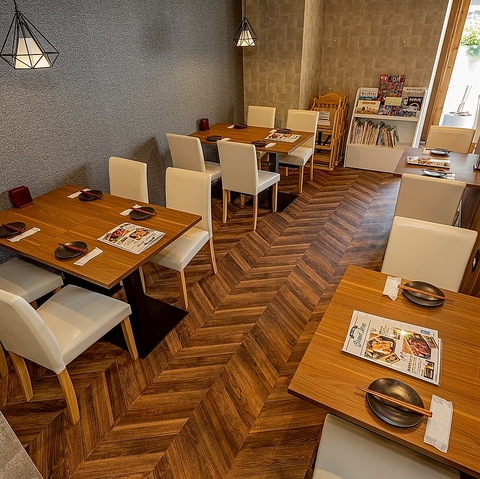 木の温もりを感じるおしゃれな店内は、デートや女子会にもぴったり。白を基調としたチェアと落ち着いた照明が、居心地の良い空間を演出します。広々としたテーブル席で、ゆったりと会話や食事を楽しめるのも魅力。お子様連れでも安心して過ごせる工夫があり、ご家族での利用にもおすすめです!
