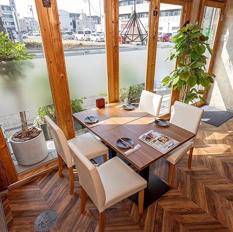 明るくて開放感のあるテーブル席は、ゆったり座れて居心地バツグン!木のぬくもりを感じるインテリアと自然光が差し込む空間で、リラックスしながら食事や会話を楽しめます。広めのスペースだから、家族や友達との利用にもぴったり。景色も楽しめて、ついつい長居したくなる心地よさです♪