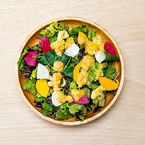 旬の野菜をふんだんに使用した彩り豊かなサラダは見た目にも鮮やかで食欲をそそります。添えられた自家製ドレッシングは、にんじん・たまねぎ・にんにく・しょうがを絶妙にブレンドし、酸味とコクが調和した味わい。野菜本来の美味しさを引き立てる、こだわりの一品です。