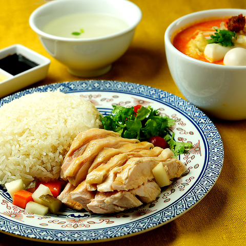 シンガポールの人気料理、海南鶏飯(ハイナンジーファン)。当店では国産大山鶏を使用しております。ふわふわに茹で上げる大山鶏と丁寧に炊きあげたジャスミンライスは大変よく合います。3色のソースをかけて豪快にお召し上がりください!