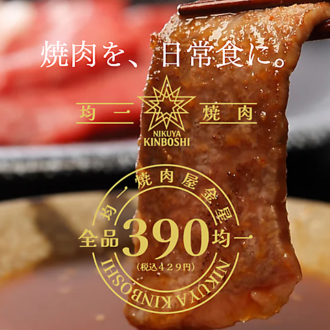 驚愕の全品390円(429円(税込))均一の焼肉店がリニューアルオープン!黒毛和牛のイチボやランプの希少部位や厚切り上塩タン、上ハラミなどの定番メニューも全て390円均一(429円(税込))で食べられます!【牛タン刺し】【名物キンパチ】【旨辛生海老】などアテにぴったりの一品やドリンクの種類も豊富で居酒屋使い、お一人様もOK大歓迎!