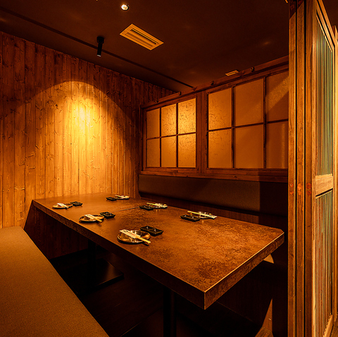 各テーブルは半個室仕様になっており、プライバシーを確保しながらゆったりとお食事をお楽しみいただけます。間接照明が優しく灯る、和の趣を感じるモダンで品格ある空間が、特別なひとときを演出します。落ち着いた雰囲気の中で、心地よい時間をゆっくりとお過ごしください。