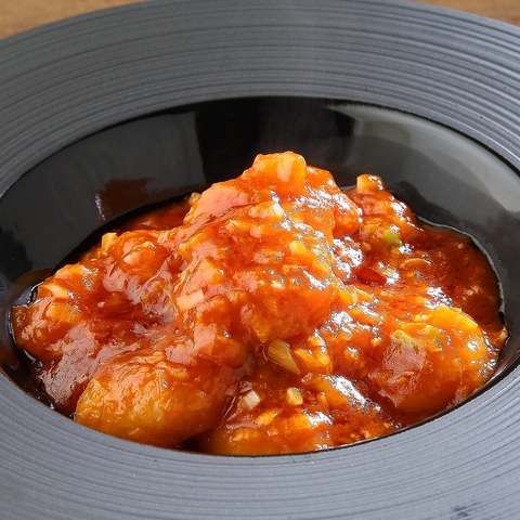 プリプリの海老を特製甘辛チリソースで仕上げた定番の人気メニュー。口に入れると広がる甘みとピリッとした辛さのバランスが絶妙で、思わず箸が進みます。ご飯のおかずとしてもお酒のお供としても相性抜群。幅広い世代から支持される、一度は食べてほしいおすすめの一皿です。