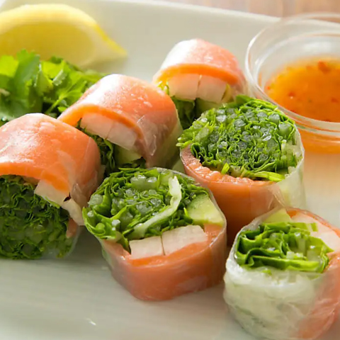 野菜をたっぷり使用したサーモンの生春巻きは、彩り豊かで見た目も楽しめる一品。ヘルシーで新鮮な野菜とサーモンの組み合わせが◎女性にも男性にも大人気のメニューです!
