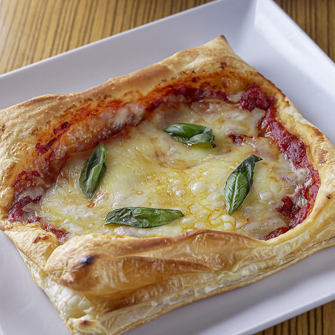 パイ生地を使用したピザはいかがでしょうか?定番のマルゲリータも、このサクサクとした食感が新しい驚きと美味しさを生み出します。とろーりチーズとトマトソースの絶妙なバランスが、お酒との相性も抜群!アツアツのうちにお召し上がりください!