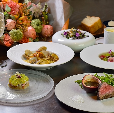 お料理は全て店内手作りにこだわり、「美味しくてヘルシー」をモットーに提供しております。コース+花束付き(2名様~・個室確約)のディナーもあり、素敵なサプライズを演出します。さらに、+1200円でデザートを盛り合わせにアップグレードすることで、甘いひとときを楽しめます。