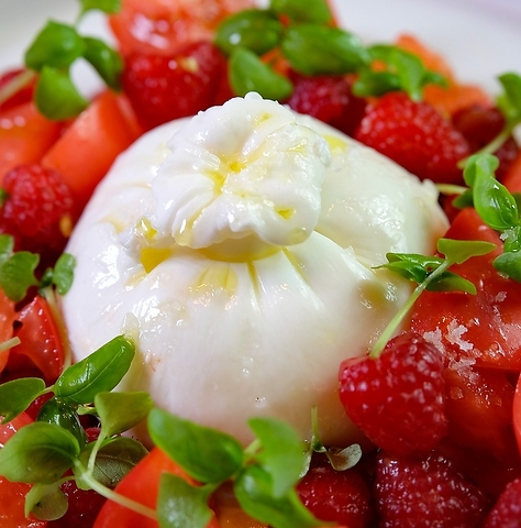 新鮮で甘いフルーツトマトと旬のフルーツ、国産のブラータチーズを使い1ランクも2ランクも上のカプレーゼ。