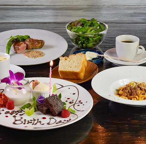 コース+花束付(2名様~・個室確約)のsumile Dinnerは、スパークリングワインの乾杯から始まり、前菜に自家製フォカッチャ、自慢のパスタ、メインには選べるお肉料理があり、季節のデザートも楽しめるのが魅力です。個室でのひとときは、記念日にぴったり。デザートはメッセージ入りの盛り合わせにアップグレードできます。