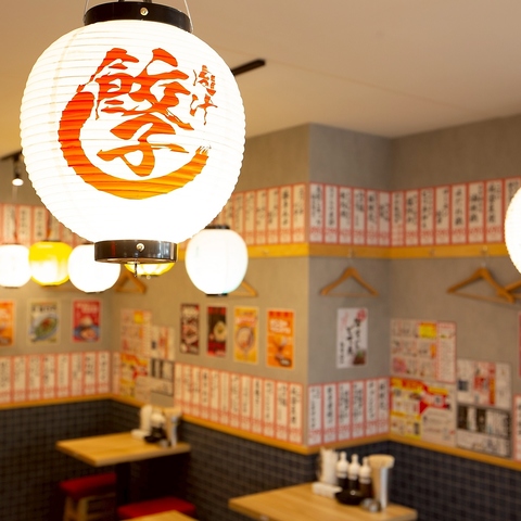 明るい木目調の店内。どこか懐かしさを感じる店内で自慢の餃子とお酒をお楽しみください。