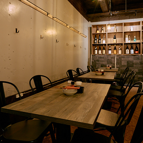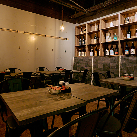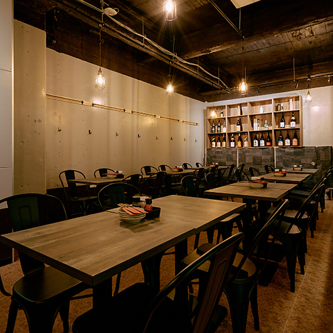 木目調のテーブルと黒いアイアンチェアがモダンな印象の空間。暖色の裸電球が温かみを添え、壁際のボトル棚が居酒屋らしい雰囲気を醸し出しています。広々とした店内は、グループでの食事や会社の宴会に最適。貸切で周りを気にせず、ゆったりとプライベートな時間を過ごしたい方にぴったりです。