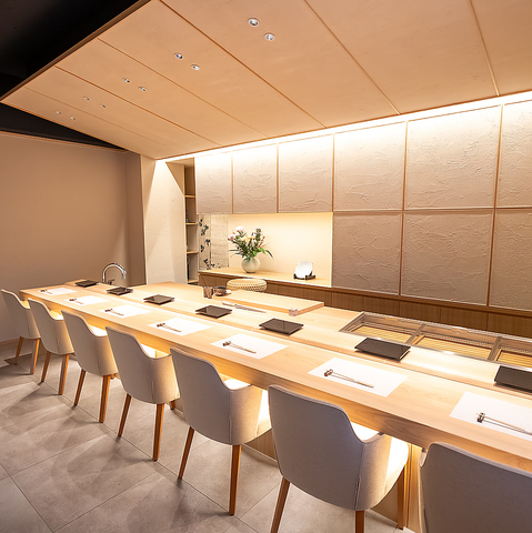 木目を基調としたスタイリッシュなデザインの店内は、広々としたカウンター席が心地よい居心地を提供します。気の合う仲間や大切なご夫婦とのお食事にもぴったり。2人の距離が近くなることで、自然と会話が生まれ、楽しい食事の時間がより一層特別なものに感じられます。木の温もりに包まれた空間で、心豊かな時間をお過ごしください