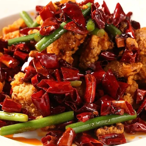 鶏モモ肉のから揚げをサクサクに揚げて、山椒と唐辛子等のスパイスで炒めました。癖になる複雑な辛味と旨味があって、お酒が進みます。