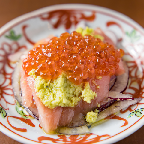 自社魚屋「魚屋海老蔵」から毎日直送される、新鮮な魚介を贅沢に使用したカルパッチョです。その日のおすすめを、それぞれの素材の旨みを引き出した最高の組み合わせでご提供!様々な味を少しずつ楽しめる小皿での提供なので、お酒のおつまみや宴会の際にもぴったり。素材本来の味を活かした、料理長の技が光る逸品をぜひご賞味下さい。