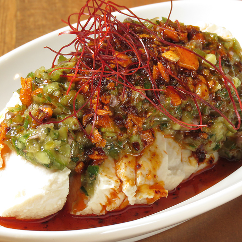 しっかりと蒸した鶏肉に、香味ラー油と花椒のしびれる辛さを効かせた四川風の一皿