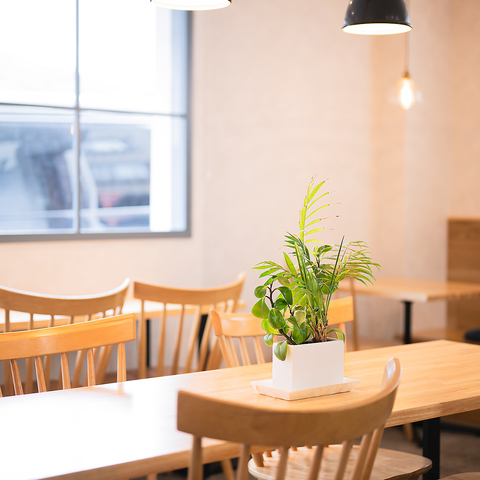 木製テーブルと椅子が並ぶ、シンプルで温かみの店内となっています。。キッチンはオープンスタイルで調理の様子が見えるライブ感も魅力のひとつ。天井から吊るされたペンダントライトがやわらかな光を灯し、ゆったりとした時間が流れる居心地の良い空間です。おひとり様からグループまで幅広いシーンでご利用いただけます。
