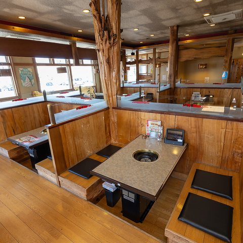 温かみのある照明と活気ある雰囲気が魅力です。広々とした店内は、ご家族での食事から大人数での宴会まで、あらゆるシーンに対応。店内は全て小上がりのお座敷席と掘りごたつ席となります。美味しいお肉を囲んで、みんなで「わいわい」と楽しい時間をお過ごしください。